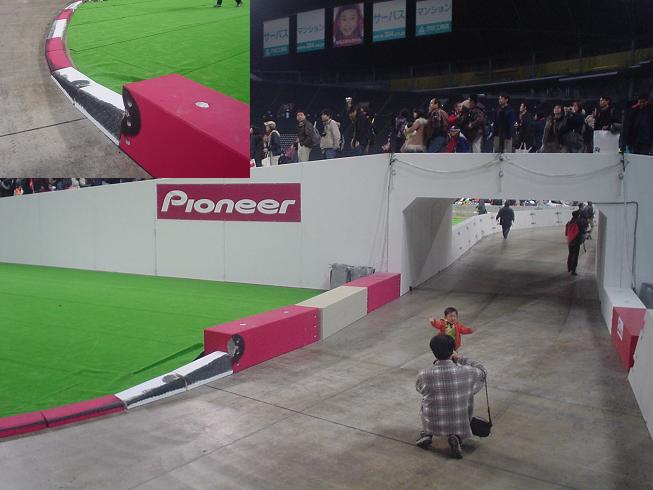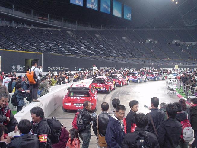 今年は、帯広のときのように駅前でのセレモニアルスタートが無い代わりに、このドームのなかでセレモニアル&ラリーショー。ご覧のように、スーパーSSコースにならべられた出走全ラリー車が並べられています。