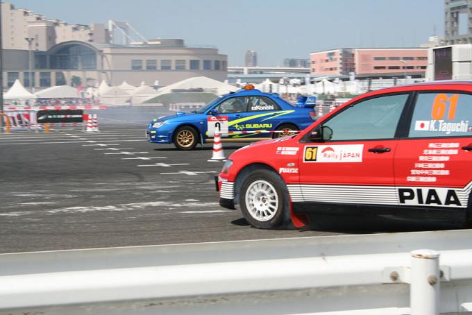 先日のモータースポーツジャパンイベントではラリーカーのデモランということで私がインプレッサのGpN(RJのゼロカー)、三菱はカツ(田口勝彦)がEVO9でデモラン。一日目は一台ずつ走行。でも2人とも共通してちょっと大変だったことがあります・・。それはラリーカーが安全のためにだいぶパワーダウンされていたこと。この後もイベント等で使われることを思えば仕方がない措置とはいえますが、何が大変って・・とにかくドーナツがパワー不足でやりにくい。ラリータイヤのグリップにでさえ時に負けてしまってます・そしてコーナリングも・・派手にドリフトさせてもトラクションがないからどんどん外側に膨らんでいってしまうし、角度がありすぎると失速してしまうし。そんなんでニュートラルステアで進入しても・・こんどはアンダーステアから復帰できず・・。とにかく苦労するんです。