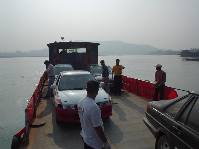 【SS2とSS3の間のリエゾンには“渡し舟”があります。クルマ4台ずつを2艘の小さなフェリーが交互に運ぶ。この上ではつかの間の休息。ドライバー同士も和やかに会話が弾みます。ちなみに写真はレッキ時のもの】