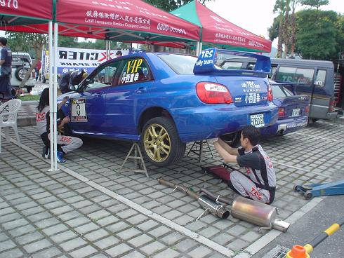 マシンはTRSラリーチームのドライバーの一人の新型“街乗り仕様”インプレッサを使うことになった。マシンといってもドノーマル。新型といっても、日本スペックではなく左ハンドルの欧州スペック。サスペンション、タイヤ、駆動系・・いろいろな“マイルド仕様”。そんなわけで、うまく走れるんだろうかという不安がよぎる。せめて駆動系のLSDくらいは欲しいところ。なぜなら、信条としてギャラリーサービスはもっとも大事なところ!だから。もちろん0カーの任務も大事だけど。安全を考えて観客に対して接近を知らせるためにマフラーだけはスポーツタイプに交換した。
