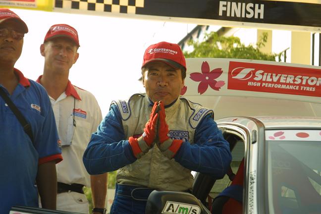 RYOさんはここでもやってくれました。なぜかトランクを開けたままポディウムへ・・・。これには誰もが『・・??』だったことでしょう。理由は、トランクに貼ってある“SILVERSTONE”のステッカーが見えるように。今回RYOさんをワークスチーム待遇(?)で対応してくれたシルバーストーンタイヤのスタッフへの“感謝”の表れ。これにはRYOさんのフィニッシュを見守っていた彼らも大満足。思わずポディウムに駆け上る・・。
