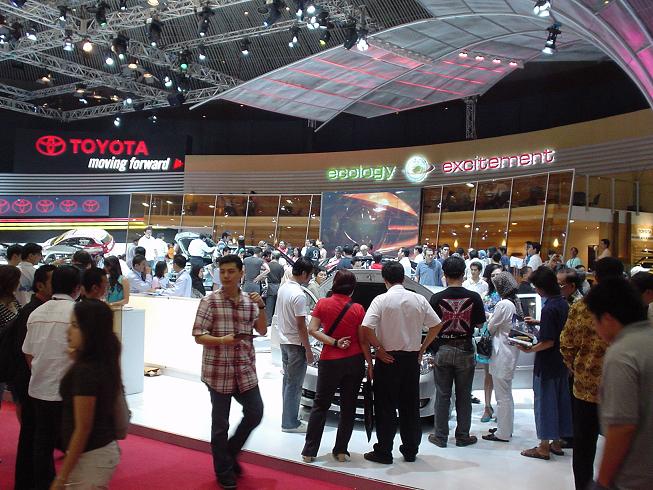 写真はトヨタのブース。向かって左側にF1やビッツ(YARIS)のレースカーを展示しながら右側にはECOカーを積極展示。ここまで両極端を見事に使い分けているメーカーはトヨタだけ。インドネシアでもECO戦略は始まっているようです。