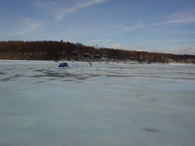 ところで昨年行われたのは、先日スノーラリーの行われた群馬県嬬恋と同じ地域のパルコール嬬恋駐車場を利用したスノー特設コース。でも今年は、自動車メーカーのドライビングレッスンでも古くから使われている長野県女神湖です。会場に着くとそこは氷の湖。管理棟から湖畔に下りていく雰囲気はそのまま「ボートにでも乗りますかっ・・」という雰囲気、湖に向かう桟橋もまさにそのままです。しかし湖面に伸びる桟橋はそのまま白い地面へ埋まっていく感じ・・つまりそのまま氷の上。この不思議さ、なんとなく好きです。