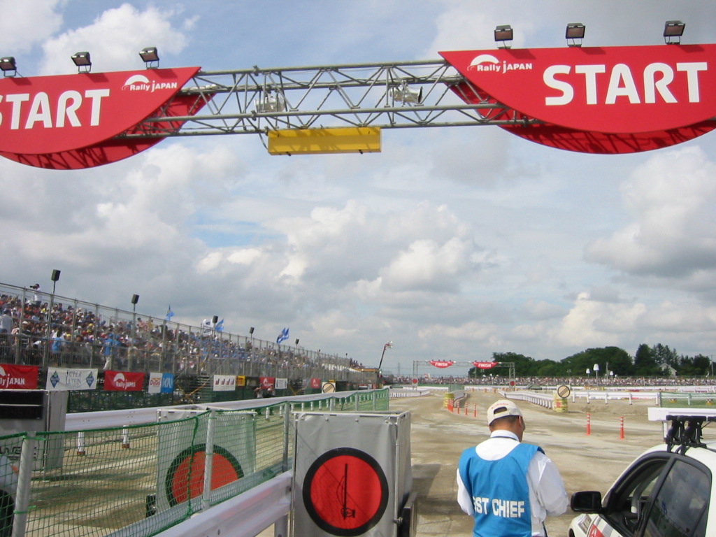 ところが・・このゲート、TVクルーといっしょに移動するんです。つまりスタート風景を撮るときにだけ設置する特別ゲート。そんな携帯?ゲートなのに地方選手権ラリーを時に上回るこの豪華さ。さすがWRCです。